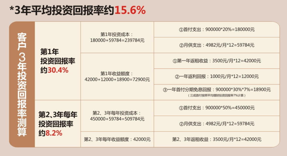 ?不同于商鋪與住宅屬性, J·LOFT產品,極大滿足了投資者進駐漢口核心商圈的愿望。J·LOFT產品層高5米,單層計價復式空間,買一層得兩層,可租可住可辦公,LOFT產品成為投資首選,除了低總價、買一得二的高性價比屬性,在投入產出比上也遙勝其他物業。下面我們針對一套總房款約90萬的房源為例測算三年的收益率:購買J?loft可享受的收益優惠:1、首付分期優惠:客戶只需首付2成,享首付免息墊付3成,1年內付清首付即可2、返利優惠:客戶可享一年每月1000元返利3、平均返租收益:客戶可享一年每月3500元租金收益。